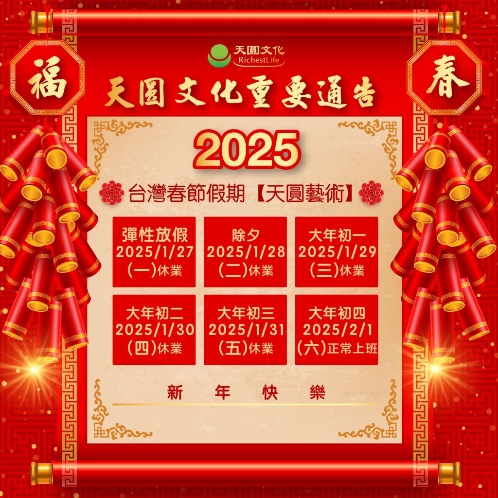 天圓文化~北中南彰化中心:春節年假期間為1/27(一)~2/2(日),【2025/2/3 (一)】恢復正式營業