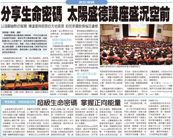 〈經濟日報〉刋登了7月26日「祈天共振求天財」講座的採訪,記者大肆讚揚太陽盛德老師用愛與感恩與天地共振的理念,及我們看似困擾的問題,在太陽盛德老師以另類角度剖析問題的本質,皆簡單、有效地改善許多人的諸多困境。