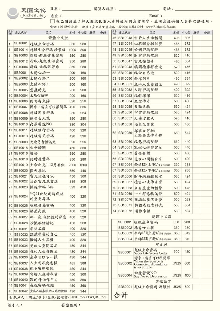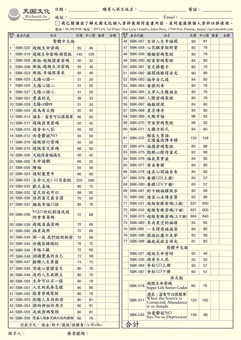 訂購單查詢/下載 提供實體中心書籍/商品現場訂購單 書籍訂購單(台灣) 點圖可放大查看及下載 商品訂購單(台灣) 點圖可放大查看及下載 書籍訂購單(馬來西亞) 點圖可放大查看及下載 商品訂購單(馬來西亞) 點圖可放大查看及下載 首頁 訂購單查詢/下載